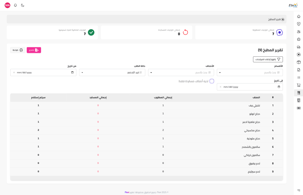 لوحة تحكم المطبخ والعمليات (Kitchen & Operations Dashboard)من أبرز مميزات النظام هو "تقرير المطبخ" (Meals Report). يقوم هذا التقرير بحل مشكلة لوجستية كبرى عبر تجميع كافة الأصناف المطلوبة ليوم معين من جميع الطلبات المختلفة في قائمة واحدة مُجمّعة وواضحة (مثال: "المطلوب تحضيره غدًا: 50 دجاج مشوي، 35 ستيك لحم..."). هذا يساعد على التخطيط المسبق، تحسين إدارة المخزون، وتقليل الهدر.